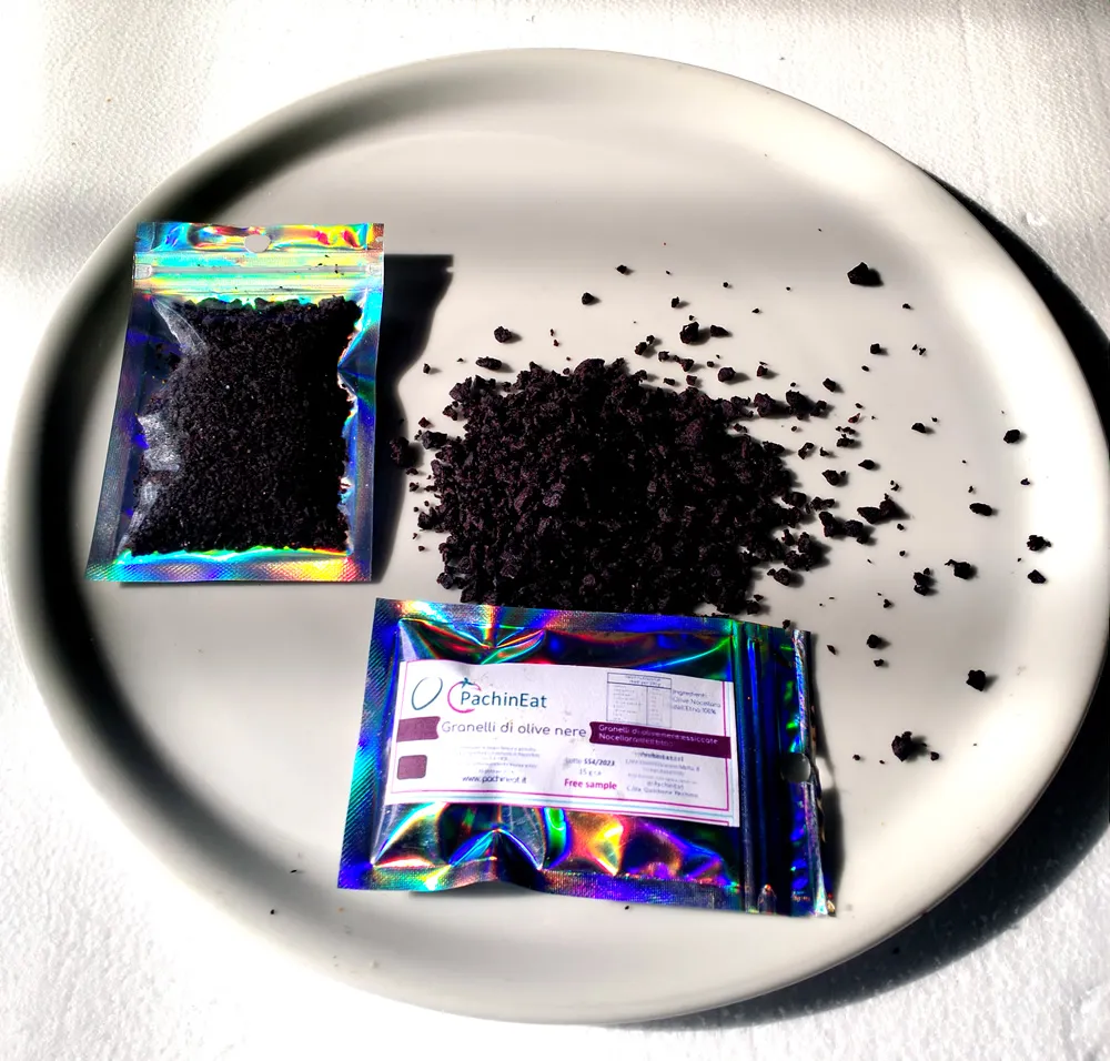 A differenza dei comuni “crumble di olive”, i nostri Granelli di Olive Nere derivano esclusivamente da olive disidratate naturalmente e poi frantumate, senza l’aggiunta di farine, sale o additivi.